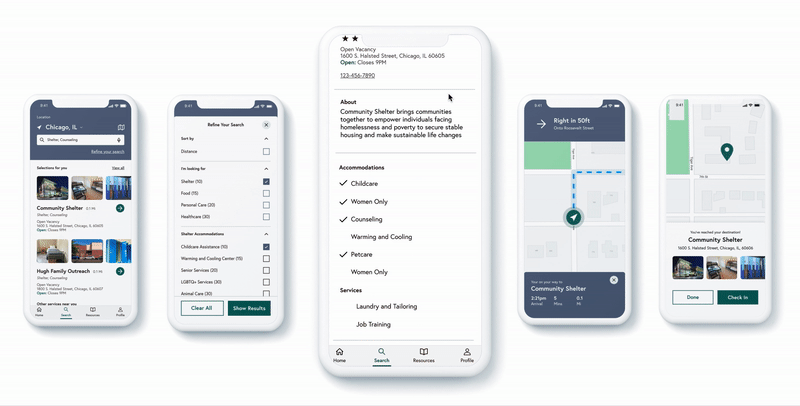 Given the insights gained during the first few phases of research, we knew that over 90% of people experiencing homelessness still had access to a cellphone. So, we pivoted to concentrate on a responsive app that could scale to something like a kiosk once those challenges were properly addressed in the future.